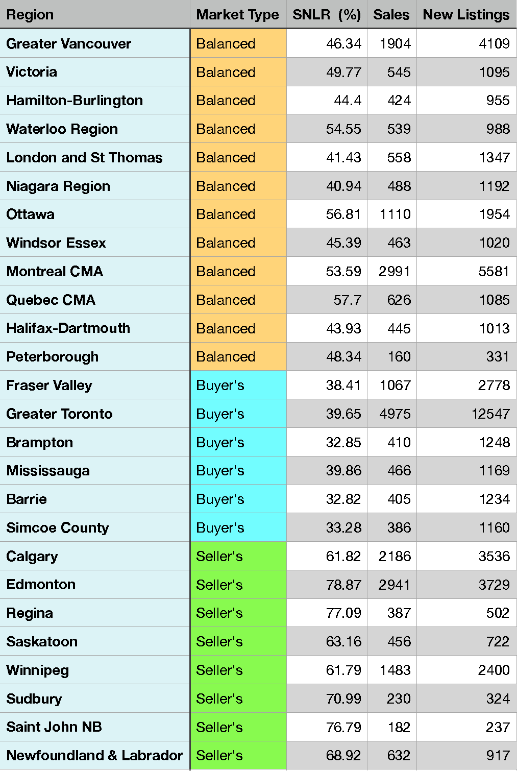 Recent data from real estate boards across the country shows clear differences in market balance. One of the simplest ways to measure this is through the sales-to-new-listings ratio (SNLR) — which compares how quickly new listings are selling relative to how many are coming onto the market.Here’s what that means in practice:- Below 40% → Buyer’s market: Supply outweighs demand, giving buyers more leverage.